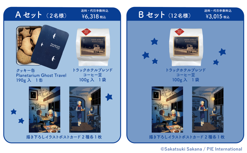 数量限定にて、クッキー缶やコーヒー豆とポストカードの、2種類のセット販売をいたします